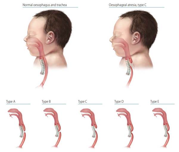 Ova se stanje često otkrije odmah nakon rođenja jer novorođenče ima poteškoće s gutanjem, obilno slini, guši se prilikom hranjenja i otežano diše.