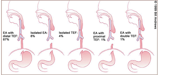 - nadut trbuh (ako postoji nenormalni spoj između traheje i dijela jednjaka koji je spojen sa želucem (distalna traheoezofagealna fistula),